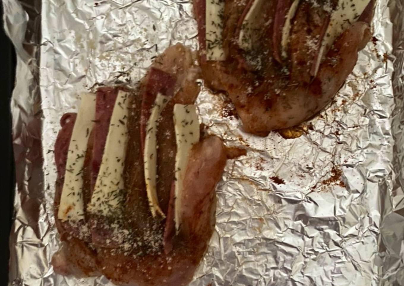 - Beri keju + smoked beef +zucchini di antaranya. Taburi garam sedikit + olive oil +paprika bubuk + keju mozza singles + bubuk parmesan + thyme flakes.