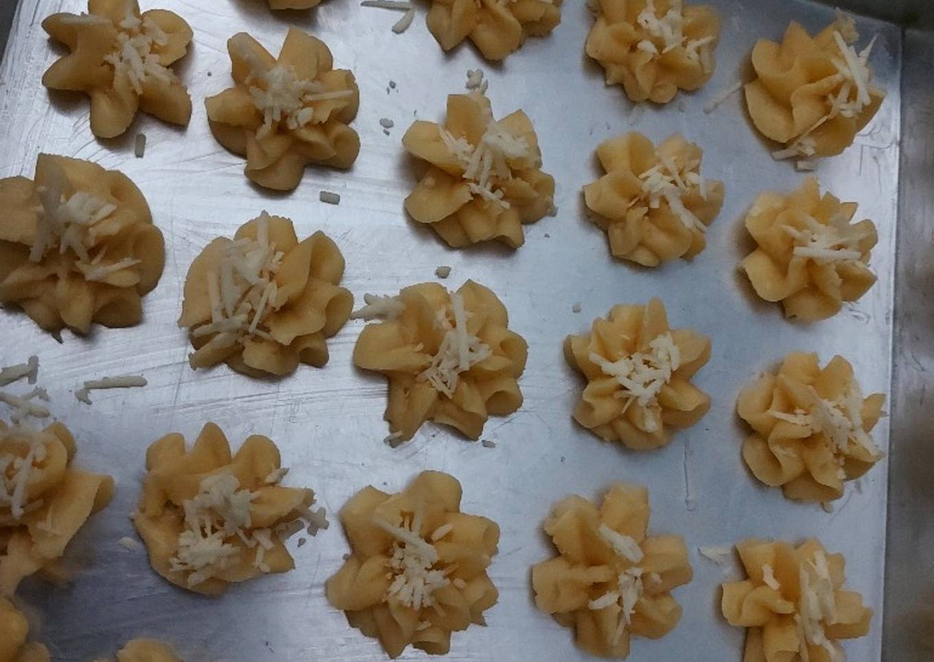 - Siapkan loyang yang sudah di olesi margarin tipis, siapkan spuit bintang kemudian semprotkan sampai habis lalu taburi dengan keju parut.