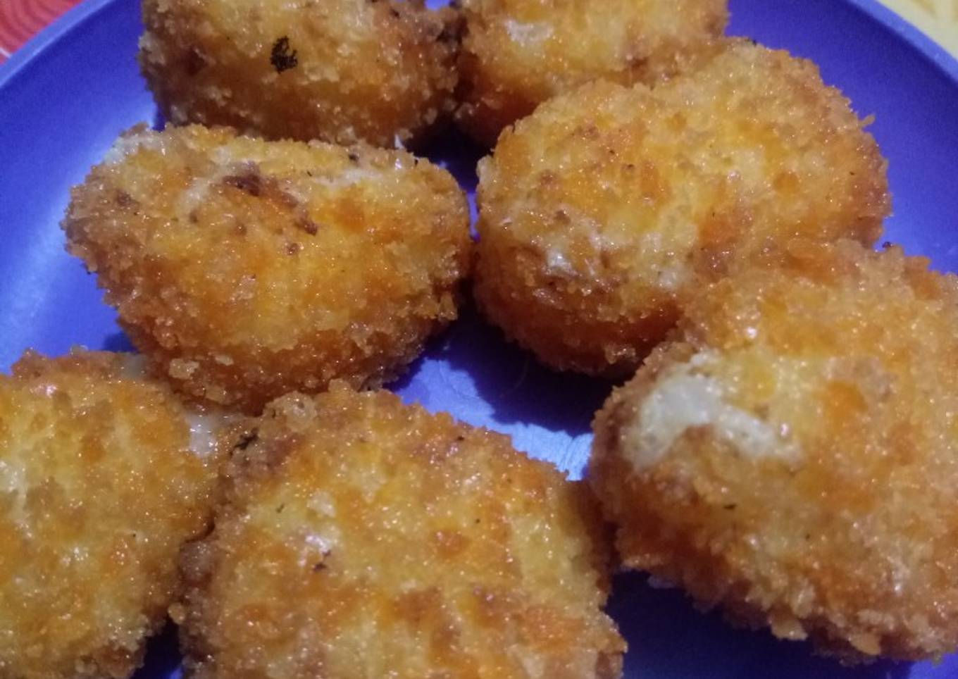 - Siapkan wadah campur tepung terigu, gula, air. Celupkan ke adonan tepung lalu gulingkan ke tepung panir