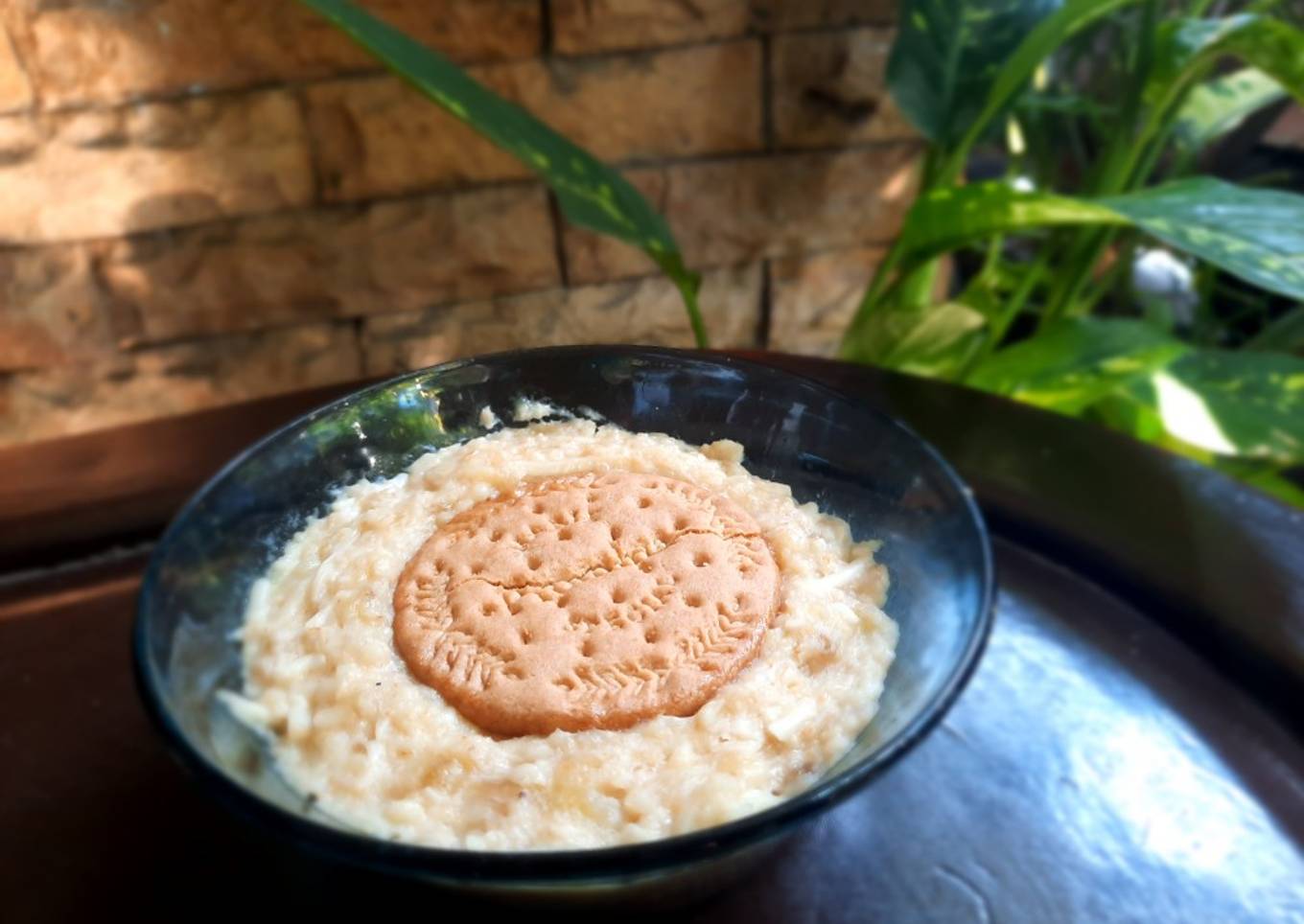 - Setelah itu masukkan ke dalam mangkuk yang sudah diberi biscuit dan lelehan mentega, karna tidak ada topping saya kasih biscuit 1 keping utuh.