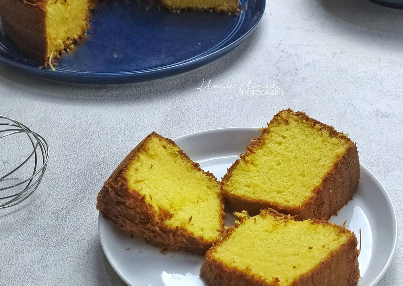 - Masukkan ke dalam loyang diameter 24 tinggi 8 cm, taburi parutan keju, lalu oven pada suhu 160°C, 45 menit api bawah, 10 menit api atas.