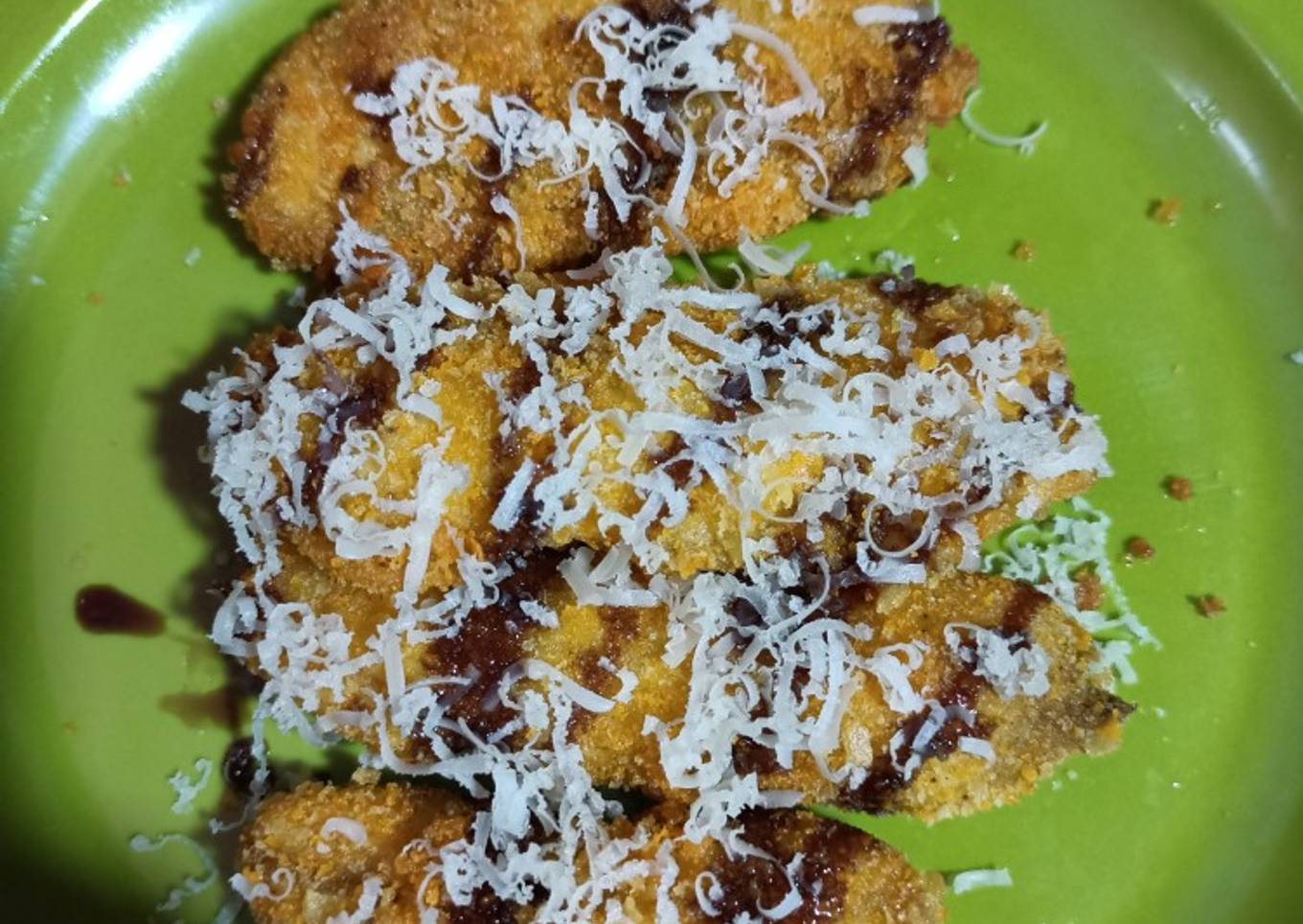 - Tata pisang ke piring, kasih secukupnya SKM di atas pisang lalu paruti dg keju di atasnya, pisang siap di sajikan, maff sebagian Uda abis di makanš¤