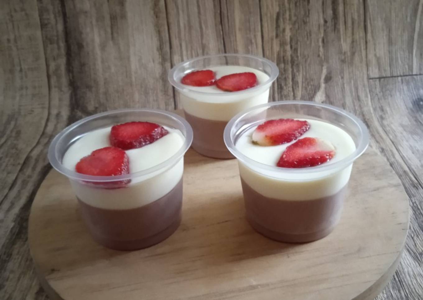 Saya bikin ini buat tambahan jajan yang dibagiin ke temennya Alesha pas dia ultah kemarin. Saya taruh di cup pudding yang kecil biar jadi banyak. Sebelum saya bagiin, saya icip dulu. Eh enak loh, pudding coklatnya ga terlalu kerasa banget ditambah vla kejunya bikin nikmat. Topping saya kasih strawberry, soalnya kalo bubuk coklat takut anak-anak ga terlalu suka hehe...