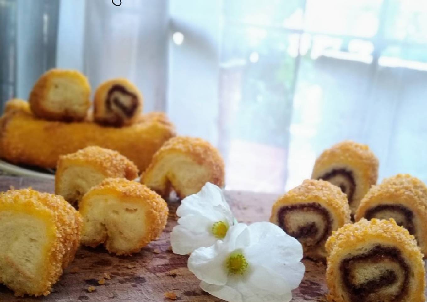 - Pipihkan roti tawar, lalu oles roti tawar dengan keju oles atau selai coklat, lalu gulung, padatkan
