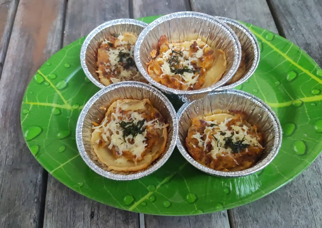 - Sementara itu, sobek sobek roti tawar hingga kecil, rendam dengan susu UHT. Tata ke dalam alumunium foil cup. Panggang hingga kecoklatan. Lalu masukkan isian ke dalamnya, taburi keju parut dan seledri cincang. Panggang hingga kecoklatan (Saya pake happy call). Angkat dan sajikan hangat.