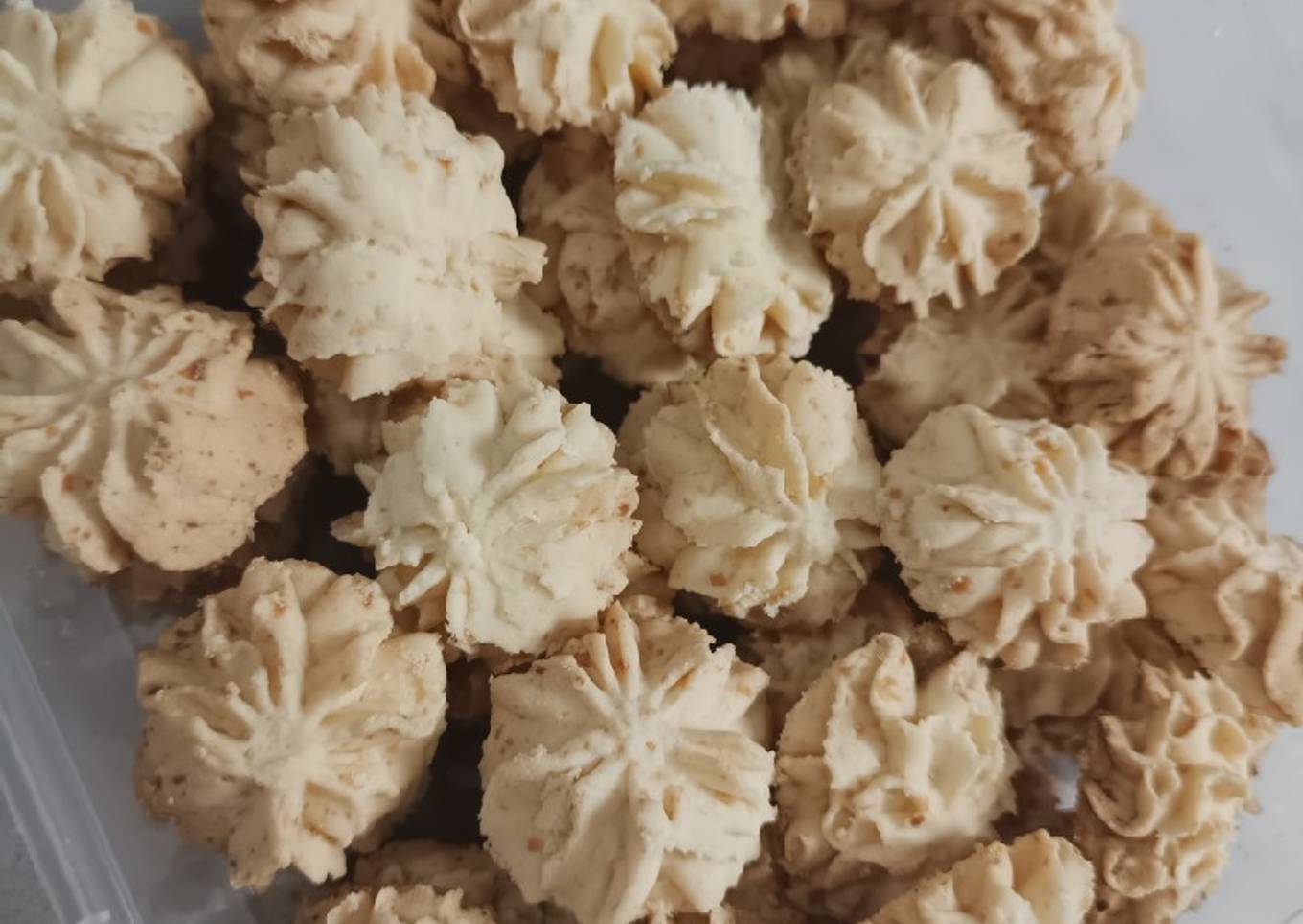 - Bentuk bunga menggunakan spuit lalu panggang menggunakan api atas bawah 160°c sampai matang lalu angkat dan dinginkan..
