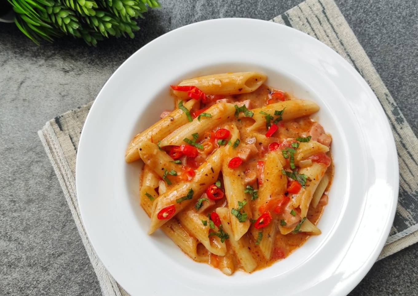 - Masukkan penne & italian herbs, aduk rata terus hingga mengental, tes rasa.