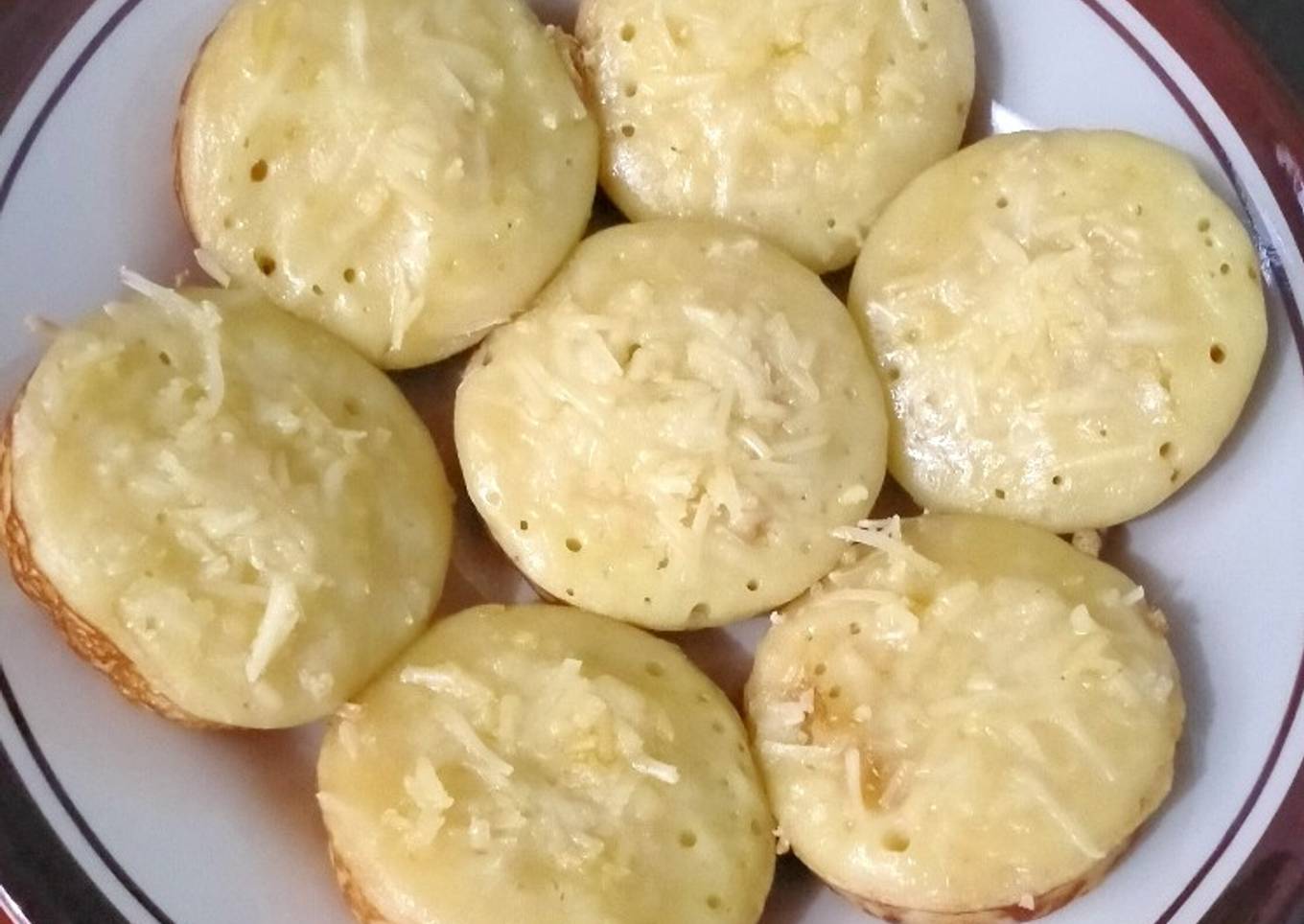- Panaskan cetakan. Olesi dengan margarin. Tuangi masing-masing lubang cetakan dengan adonan. Taburi dengan sisa keju parut di atasnya. Masak sampai kue matang.